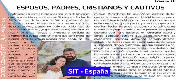 Intención Julio – Agosto 2024 – S.I.T. España. Nº 11 Seguimos pidiendo en estos meses por los 11 pastores cristianos detenidos en Nicaragua a principio de año. Esta vez centrándonos en la situación de desamparo de Marisela de Fátima, una de lo.... Leer más