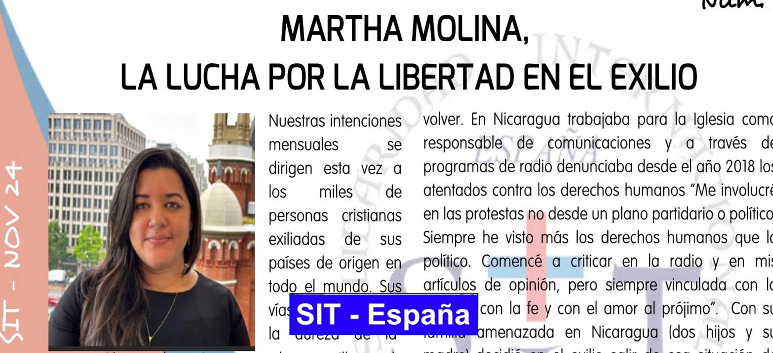 Hablar de Martha Molina es hablar sobre la persecución religiosa en Nicaragua. Desde hace años Martha recopila todo los relacionado con la persecución en su país. Ya son cinco los informes realizados en PDF. El primer informe lo empezó a escribir después de rezar el rosario y de pasar de una situación de silencio y encerramiento en su exilio en EEUU a un decirse a si misma que se “sentía Iglesia” y por ello no debería de callar. Sentirse Iglesia es una expresión fuerte, verdadera y esencial, ya que no es trabajar para o por la Iglesia (esto no es una empresa o país, equivocada la gente que piensa así), sino serlo: SOMOS, SOY Y NO SÓLO ALGUNOS LO SON, SINO TODOS/AS. Cada persona es Iglesia, es pueblo de Dios y tiene que actuar como tal. Así lo hizo Martha, aún sabiendo que su familia corría peligro en Nicaragua, escribiendo la verdad de una persecución que todos conocemos con datos sistematizados gracias a ella. La Intención de este mes es por todos aquellos valientes profetas de nuestros días que no dejan de ser ni de seguir a Cristo porque el primer gobernante de turno los acosa o expulsa.